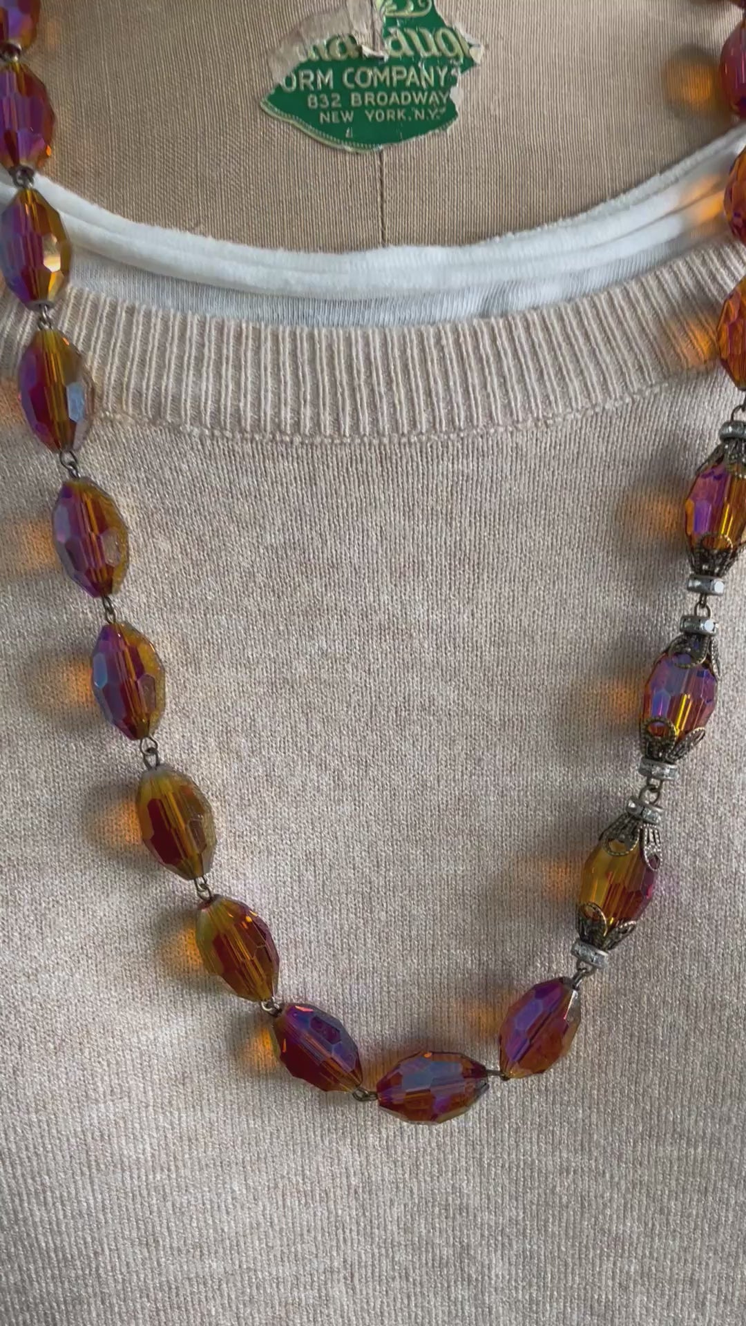 Irresistible, essential, mid length, layering necklace. Sophisticated, clean, elegant, and easy. Vintage unique amber colored fluted crystals, that pick up a purple opal glow. Sweet rhinestone detail. Adjust from approximately 24 to 26 inches long. Styled with our long essential pearls and a one-of-a-kind necklace to give you an idea of how versatile this must have necklace is.